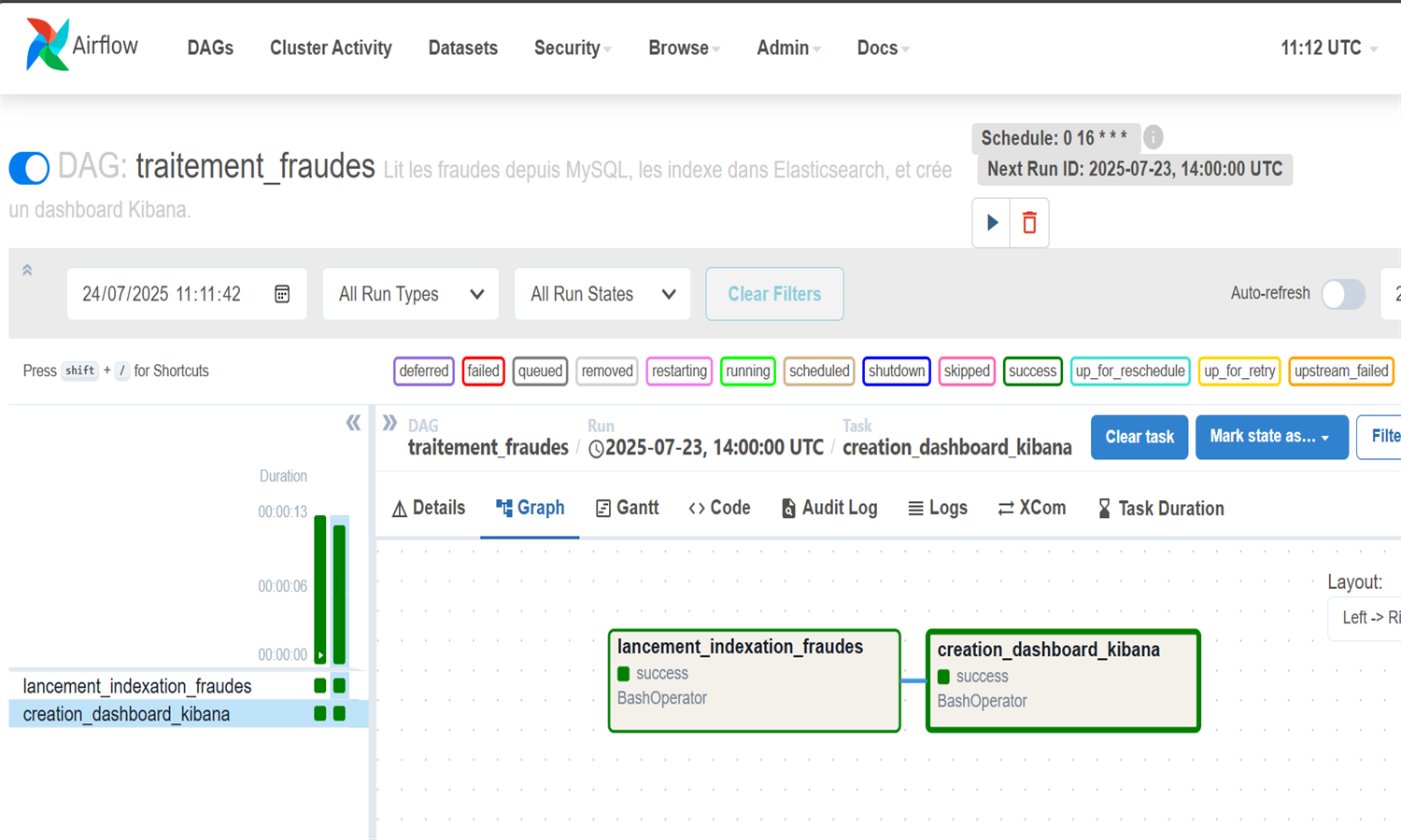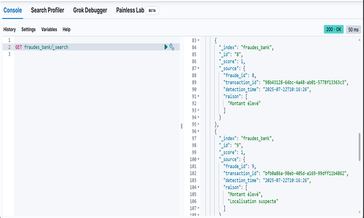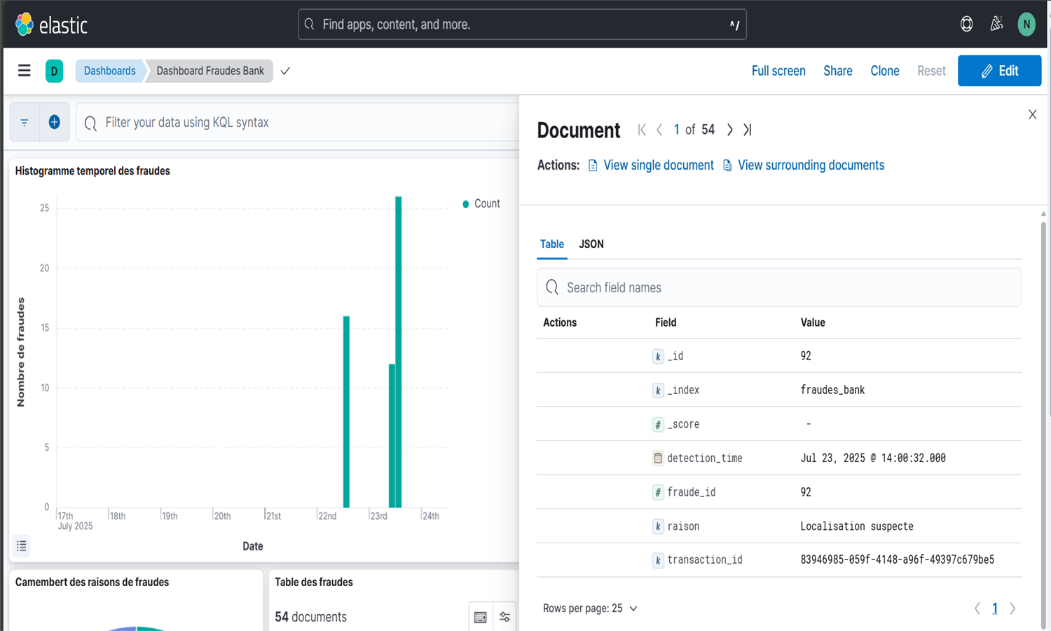 Cette application détecte automatiquement des fraudes bancaires en temps réel via un pipeline complet de streaming. Les données simulées sont envoyées vers Kafka puis traitées par Spark Structured Streaming selon plusieurs critères (montant élevé, localisation douteuse, moyen de paiement). Les fraudes détectées sont stockées dans MySQL et indexées dans Elasticsearch pour être visualisées sur Kibana. L'orchestration des tâches est assurée par Airflow, sauf pour le streaming Spark autonome. Un dashboard Streamlit final permet une analyse interactive des fraudes. L’ensemble est dockerisé pour un déploiement rapide et modulaire.