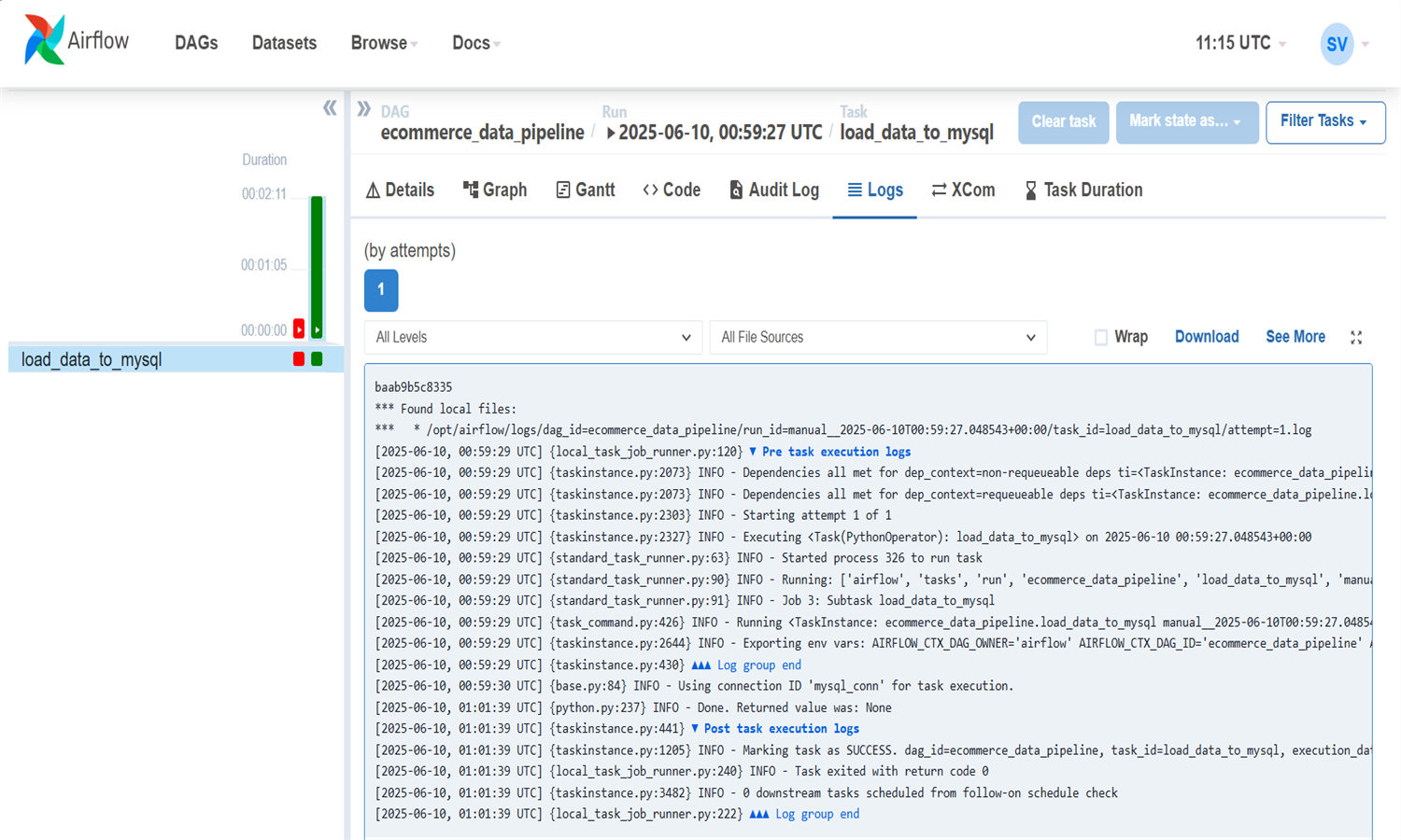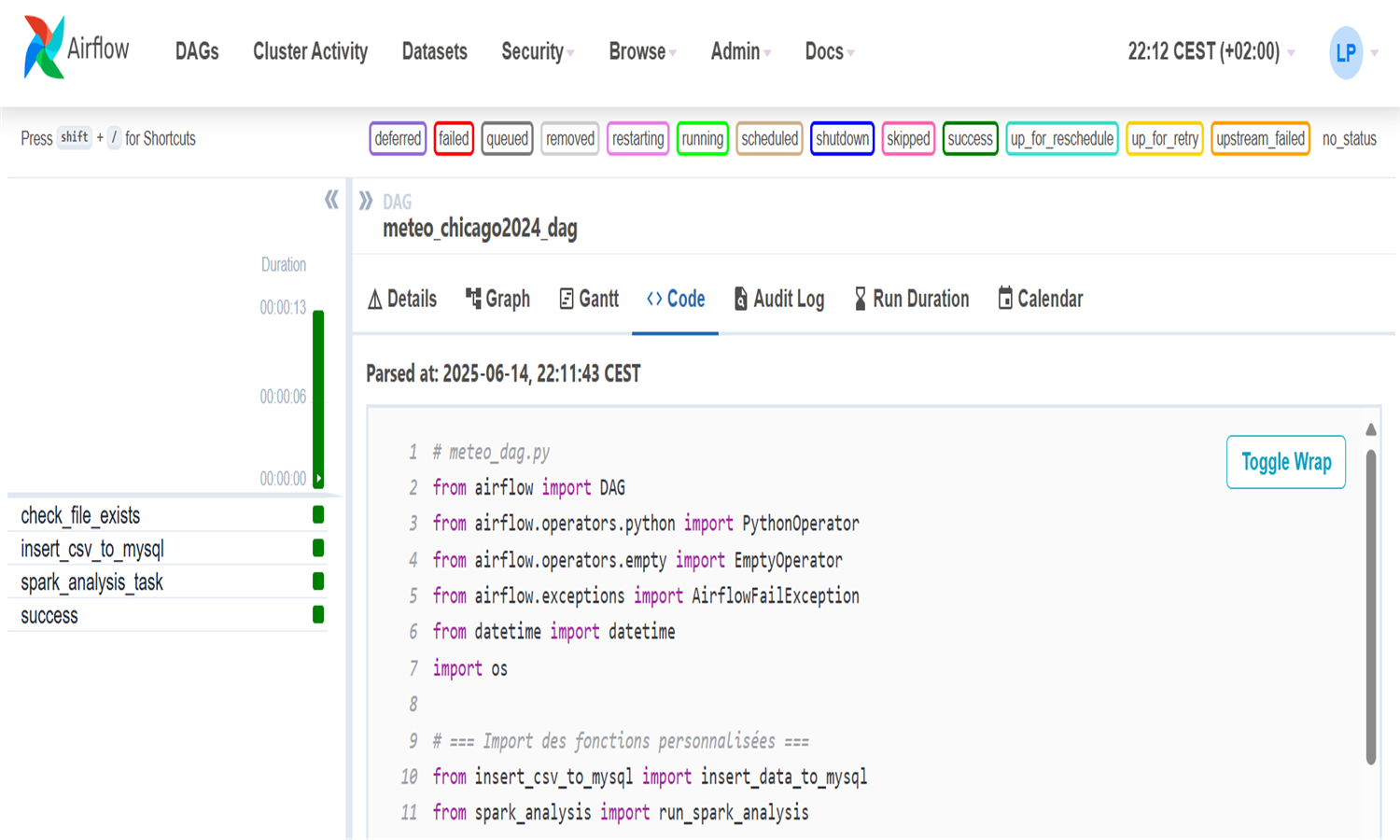 Le fichier Excel est d’abord converti en CSV, puis traité par un script Python intégré dans un DAG Airflow.
