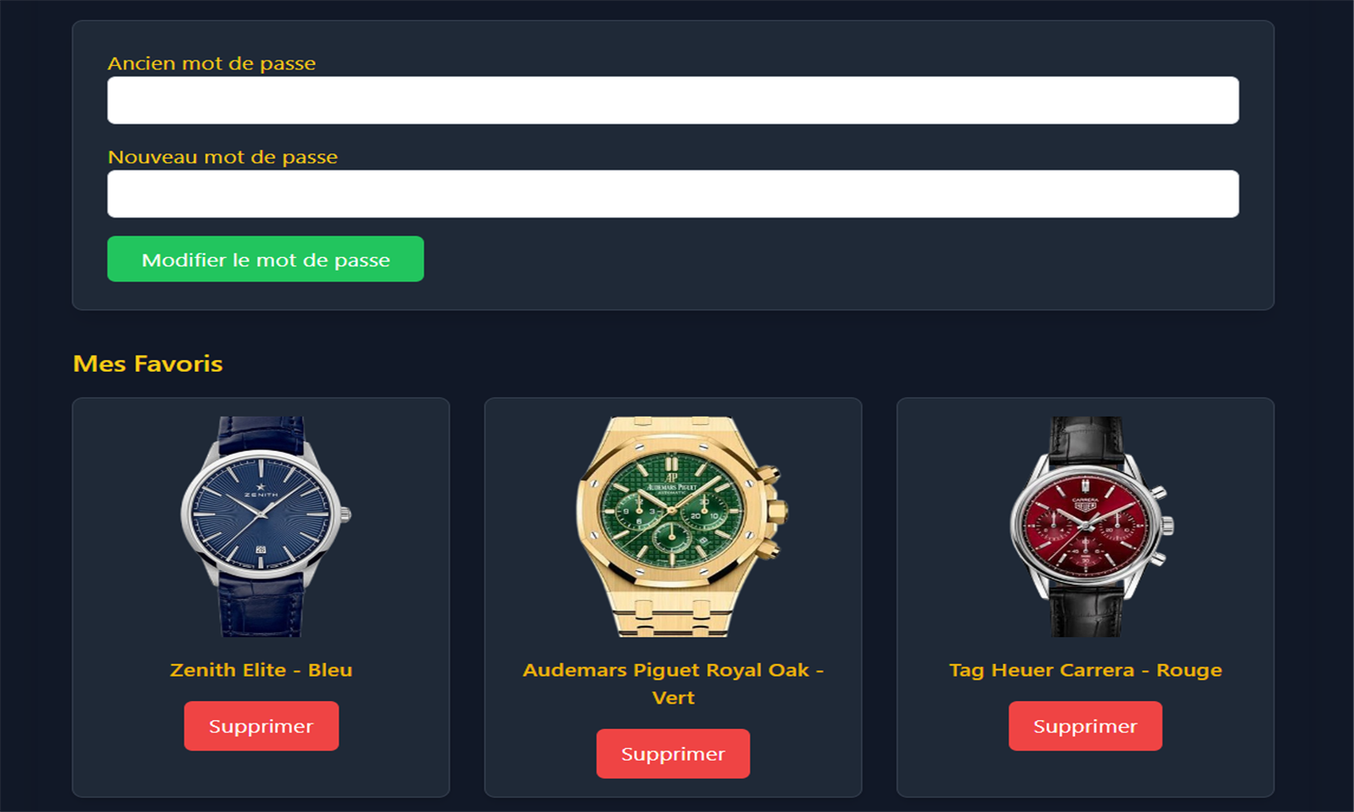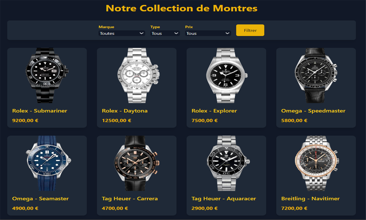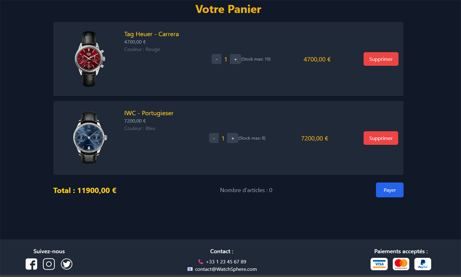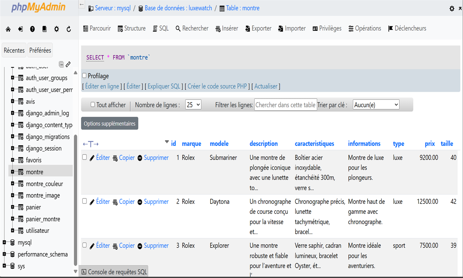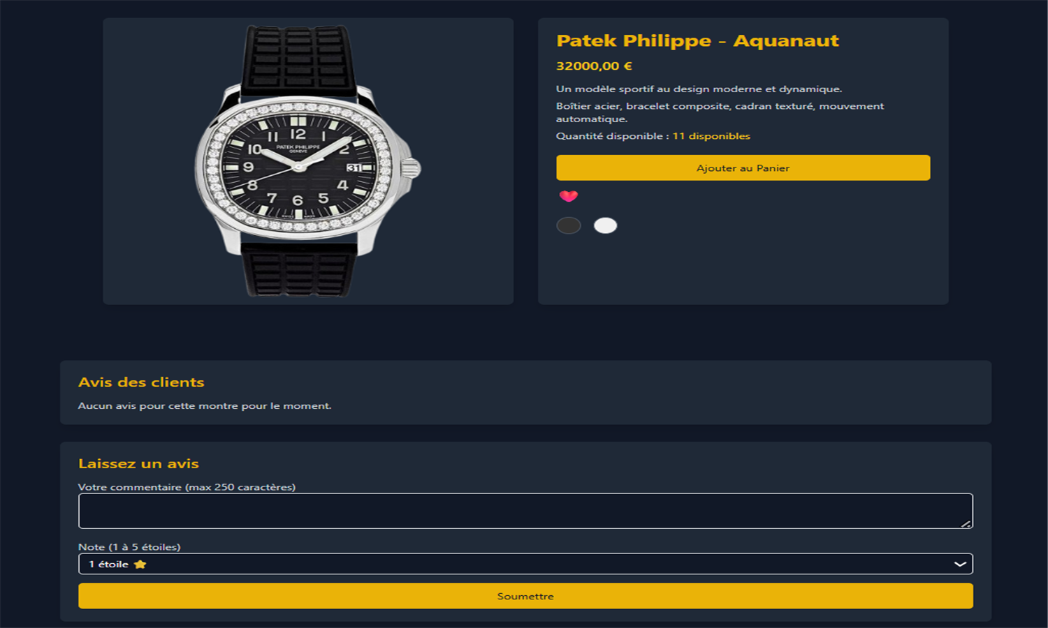 WatchSphere est une plateforme e-commerce développée avec Django, dédiée à la présentation et à la vente de montres de diverses marques. Les utilisateurs peuvent créer un compte, gérer leur profil, consulter les montres par filtres (type, prix, marque), laisser des avis et constituer une liste de favoris. Chaque montre dispose de variantes de couleurs avec image et stock associé. Le panier permet d’ajouter des articles, modifier les quantités et visualiser le total. La base MySQL structure les entités clés comme Utilisateur, Montre, Avis, Favoris et Panier.