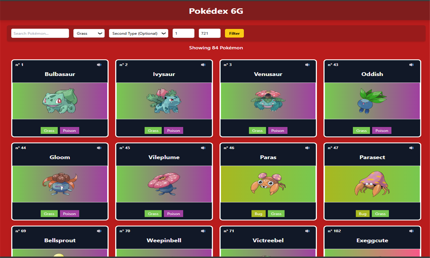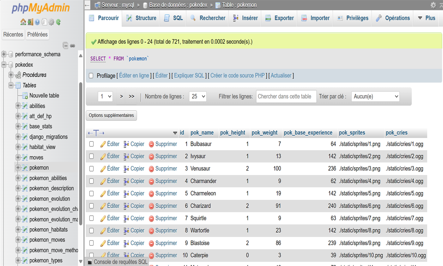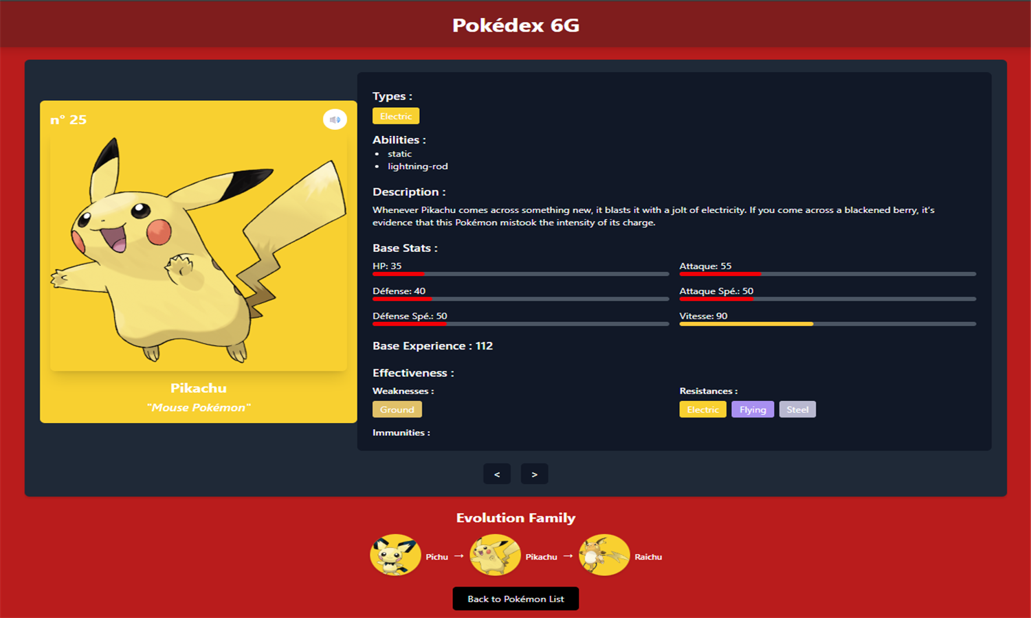 Cette application Django est une base de données enrichie de Pokémon, affichant uniquement ceux des générations 1 à 6. Les données proviennent de la PokéAPI, incluant noms, tailles, poids, statistiques de base, types, capacités, sprites, cris et descriptions. Chaque Pokémon est lié à ses types, capacités (avec statut caché ou non), statistiques, et descriptions textuelles. Les types possèdent également des couleurs personnalisées et une table d’efficacité des types a été ajoutée pour gérer les multiplicateurs de dégâts. Les données ont été restructurées et normalisées pour une gestion relationnelle propre et évolutive.